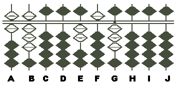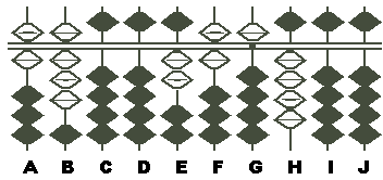 Step 2: Since the multiplier is a four-digit number, suppose that 250 has been multiplied by 1000, producing 250,000 on EFGHIJ, with G as the unit rod. Now multiplying the 6 on A by the 5 on F, set 30 on GH. (Fig.2)